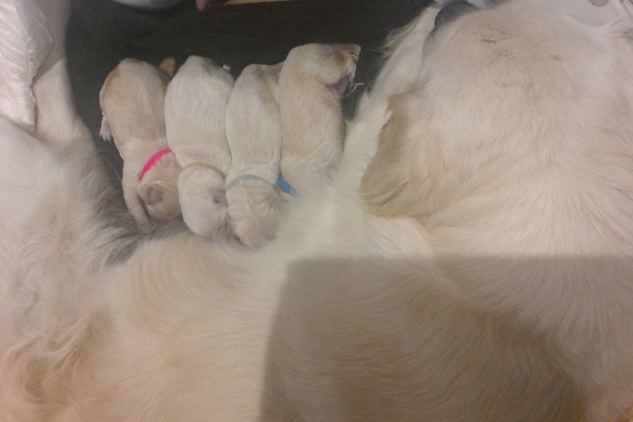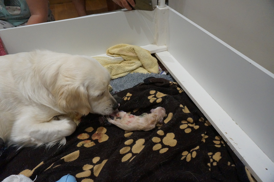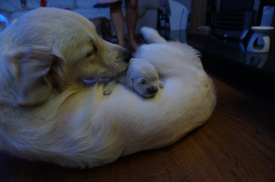 Elsa continued to look uncomfortable during the evening and kept making a little squeeking noise. Then she started to have contractions, three strong ones close after each other. Sarah got into the whelping box and encouraged Elsa to join her. Elsa thought it was lovely having a cuddle with her mum. So much so she had no more contractions and at about 12pm we all desided to go to bed. Elsa went to the spare room with Sarah and slept soundly next to her all night.