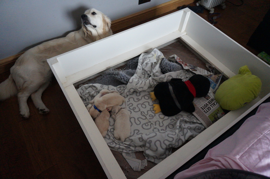 Normally we hae the whelping box in our bedroom for the first three weeks, however sarah wants to be part of the process so we have set it up in the lounge. We don't leave the mum and puppies alone at all for the first three weeks so having the whelping box in our bedroom helps us get at least a little sleep at night. This time Sarah wants to be involved, luckily the sofa is quite comfortable.